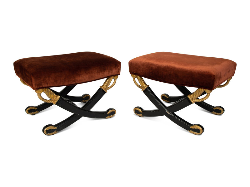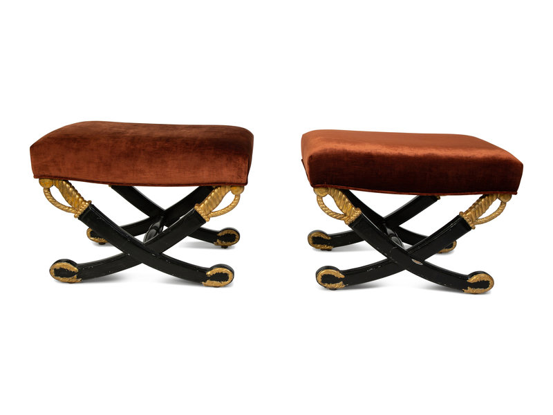 A Pair of Hollywood Regency Style Ebonized and Parcel Gilt Crossed-Sword Benches