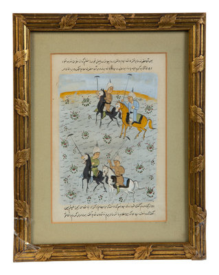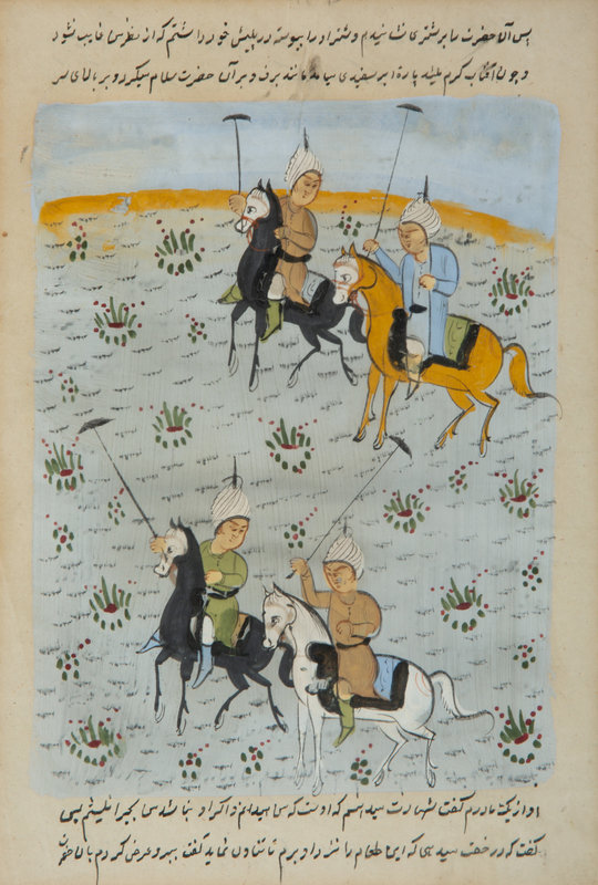depicting four polo players; relating to the story of martyred Arab prophet "Hussain"; with text in Farsi on verso.