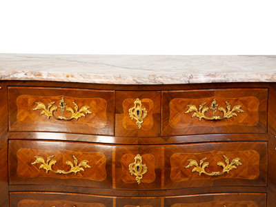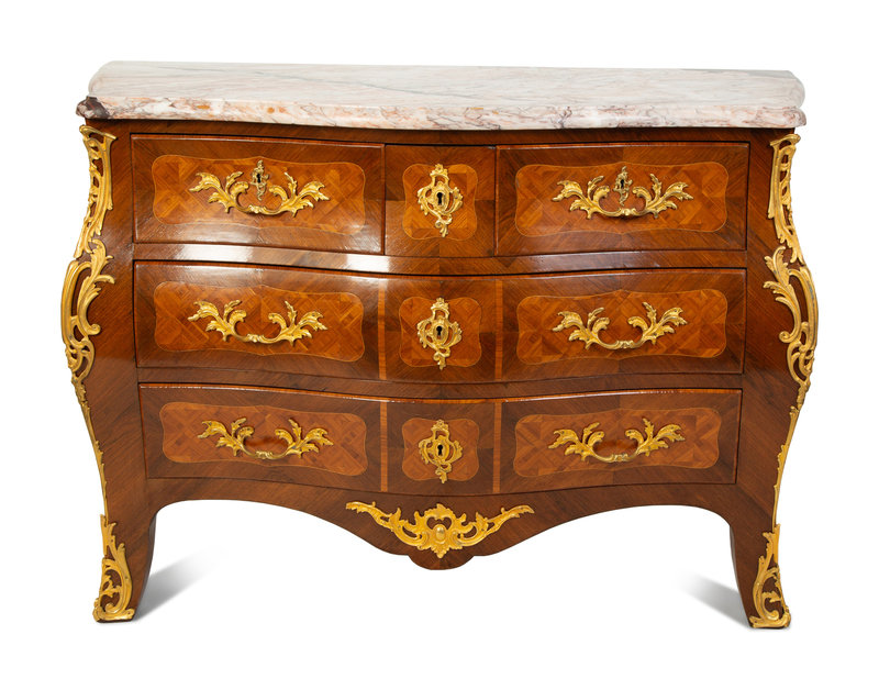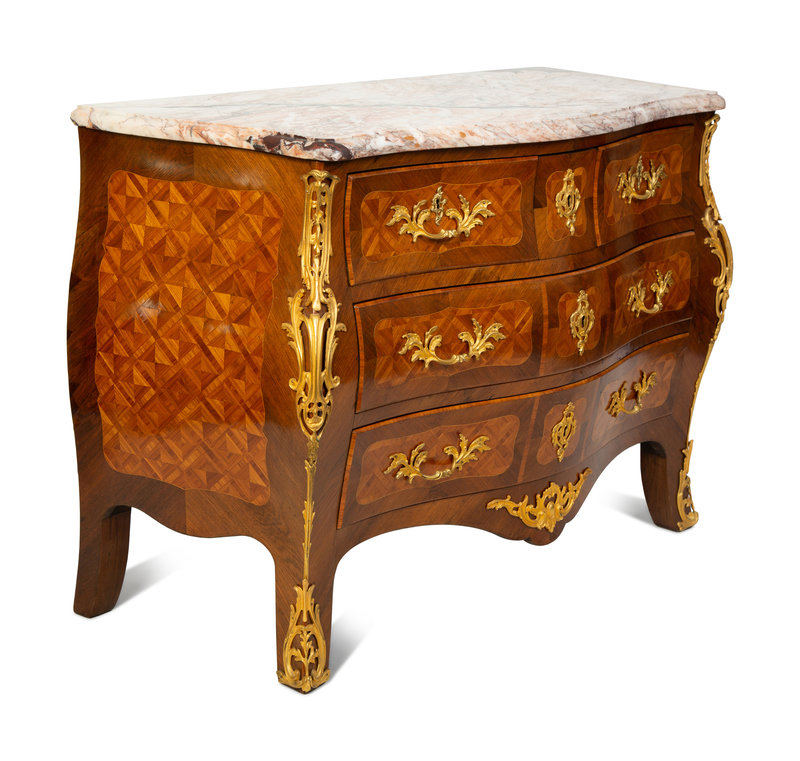 A Louis XV Style Kingwood Parquetry Marble Top Bombe Commode