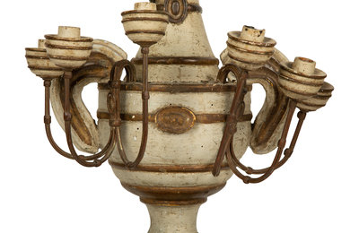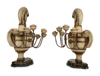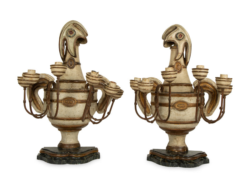 A Pair of French Painted Wood Three-Light Candelabra