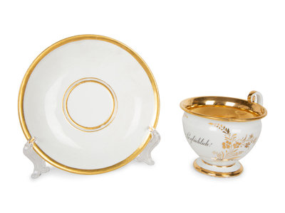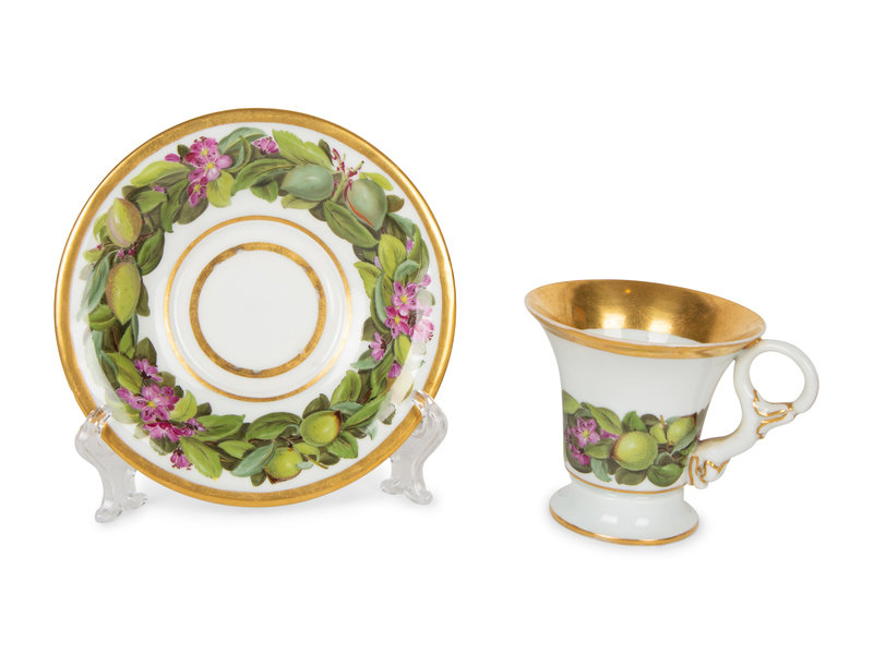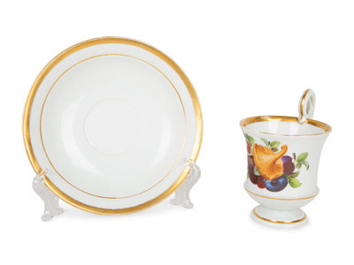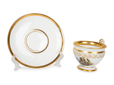 Largest, cup height 4 1/4 inches, saucer diameter 6 inches.