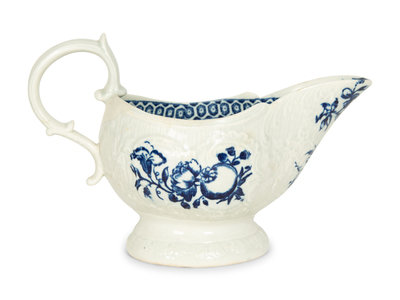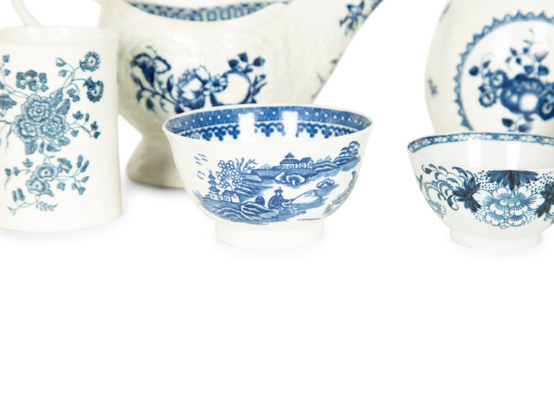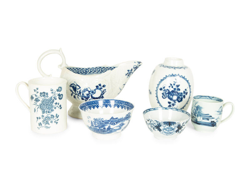 comprising a Worcester tea caddy, small mug and tea cup, together with a sauce boat a tea bowl and a Liverpool handled cup.