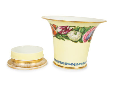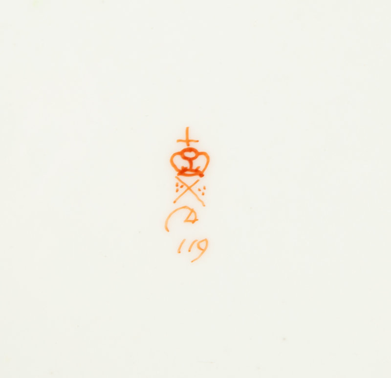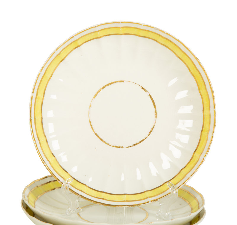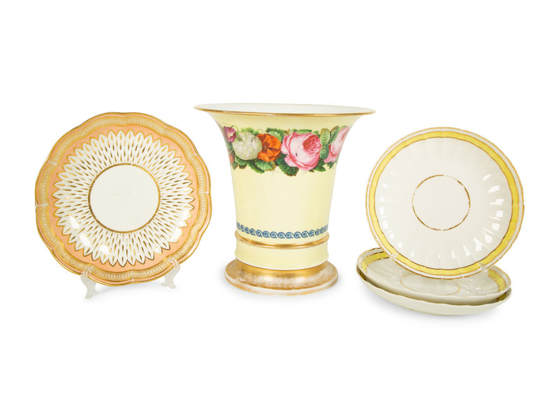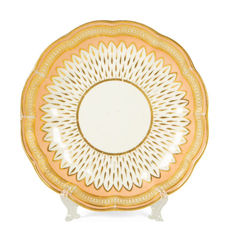 comprising a cache pot with drip stand, three Derby Duesbury & Keen plates and a Derby deep dish with coral and gilt decoration.