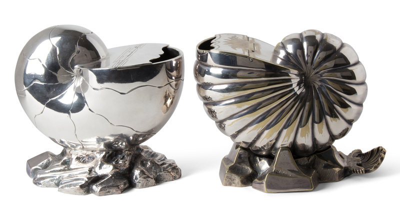 one by Atkins Brothers, Sheffield, the other unmarked with shell thumb piece, each with hinged lids and cast rock bases.