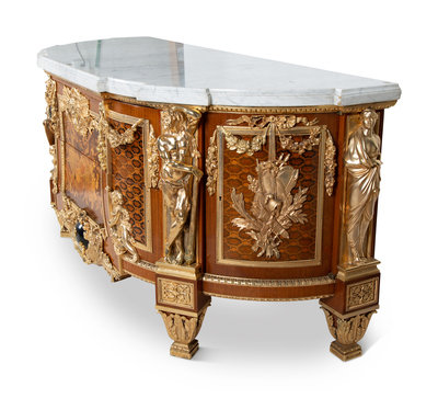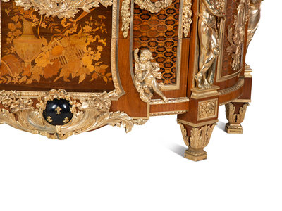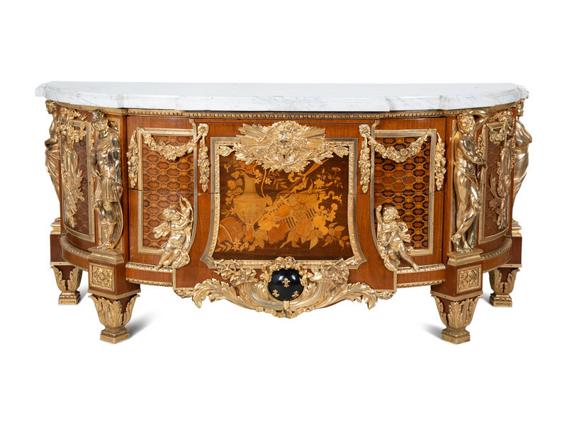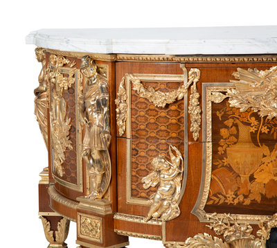 A Louis XVI Style Gilt Bronze Mounted Marquetry Marble-Top Commode After the Model by Jean-Henri Riesener