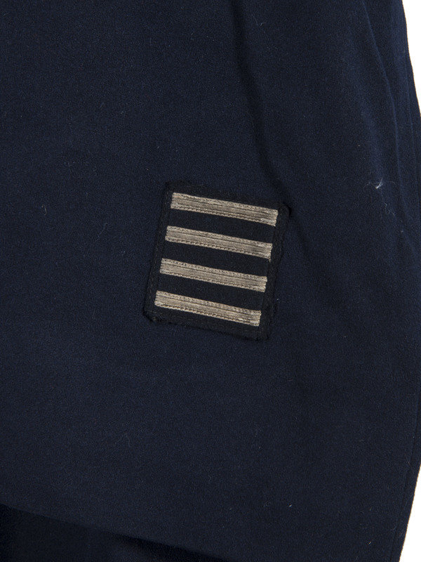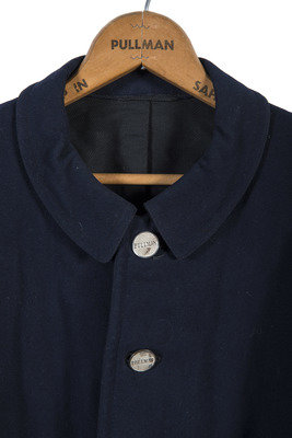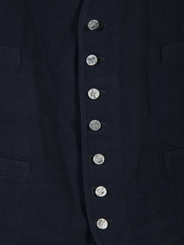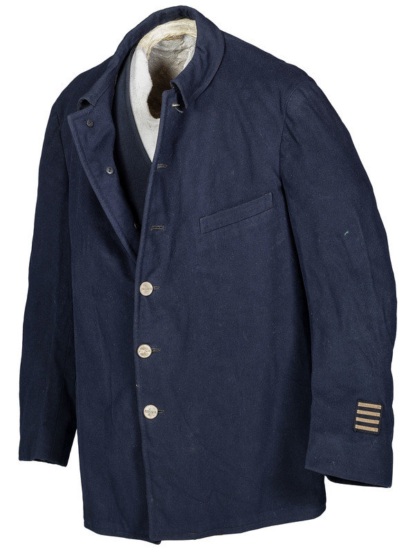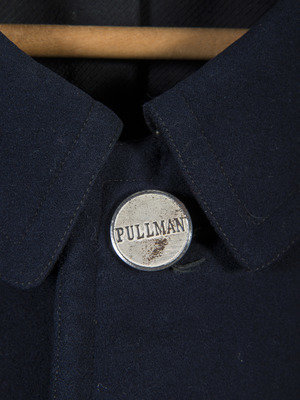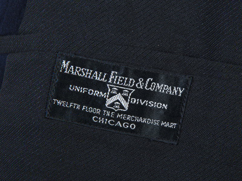 Early Pullman Railroad Company porter's uniform jacket. Heavy wool-like material with approximately 2-in. collar, 34 in. length, 24 1/2 in. sleeves, and 19 in. shoulders. Left chest pocket and right lower pocket. Lined with a lighter black textured fabric. Retains six metal buttons stamped "PULLMAN." Left sleeve with 4 bar insignia. Interior manufacturer label "Marshall Field & Company / Uniform Division / Twelfth Floor the Merchandise Mart / Chicago." Overall good condition with light wear to exterior, interior sleeve lining separating from black interior lining on one side.
