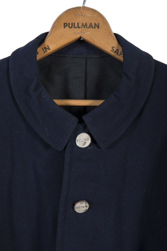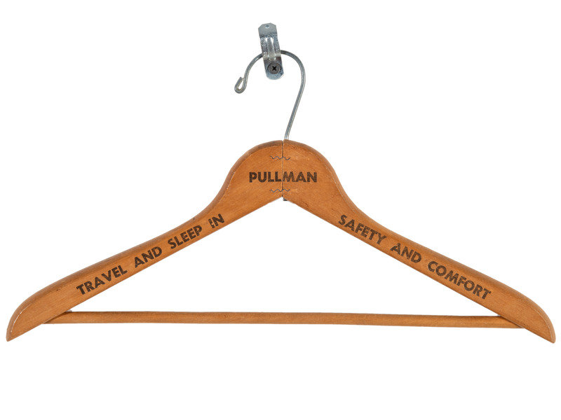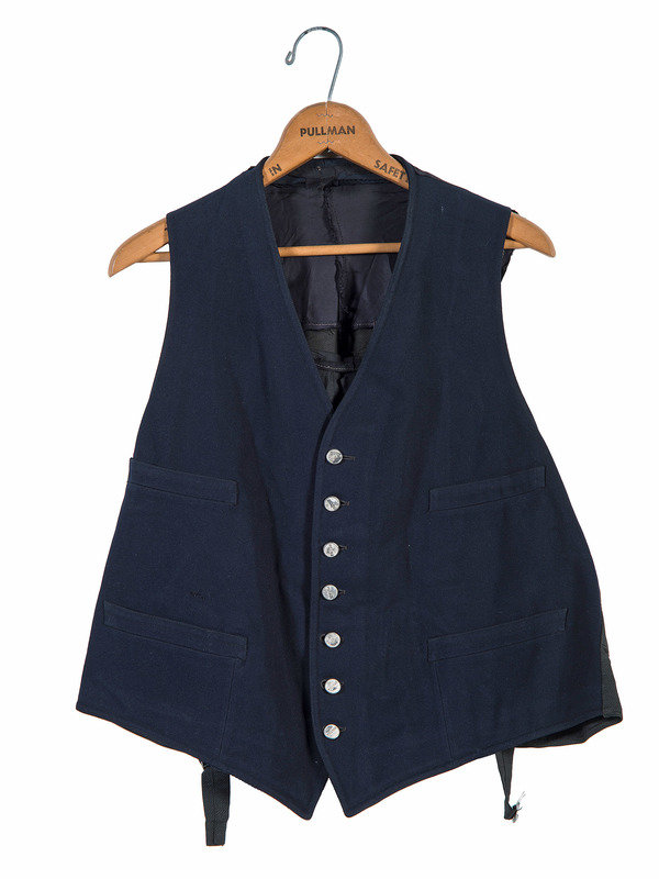 [With:] Matching 4-pocket vest that retains 7 "PULLMAN" buttons. Vest and its interior lining with wear consistent to age and use. -- Pullman wood hanger featuring text on both sides "Travel and Sleep In Pullman Safety an Comfort."