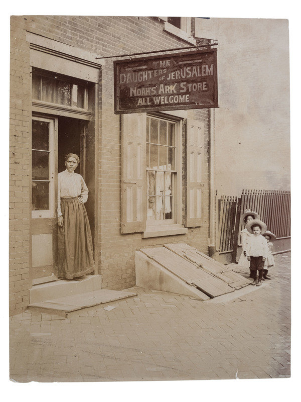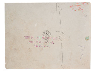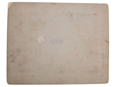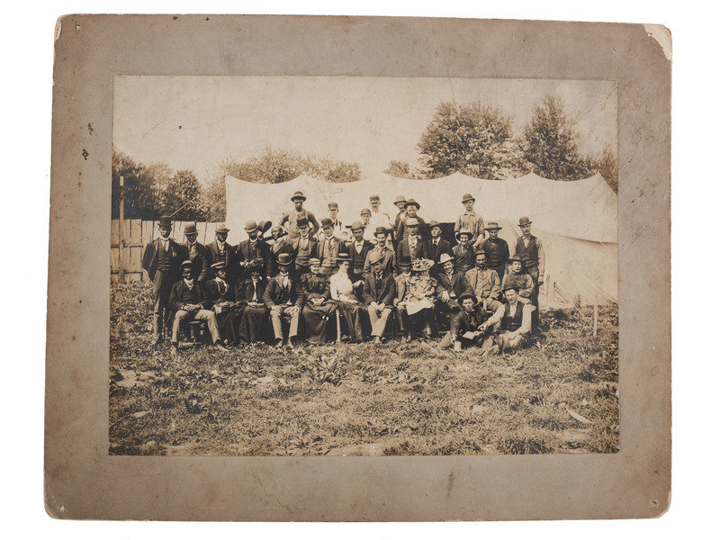 8 x 6 in. silver gelatin photograph on 10 x 8 in. mount (some spotting/soiling to print and mount; corner and edge wear to mount). Photographer's ink stamp on verso. Outdoor view of 10 African American subjects and 25 white subjects, most dressed in their Sunday best, posed in front of a large tent. Although unidentified, this photo may document a mixed-race religious revival meeting.