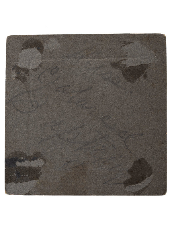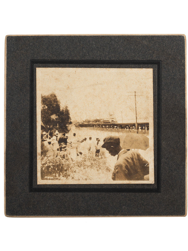 2 1/4 x 2 1/4 in. silver gelatin photograph on cardstock mount (toning, surface soiling, spotting, and small tear to right edge; mount verso with adhesive residue and some paper loss). Pencil inscription on verso reads, "Miss Colored Baptizing." A young African American man wearing a suit stands with his back to the camera on the riverbank in the foreground of the image, while a group of African American subjects in light clothing stand closer to the water's edge. A large ship is just visible beyond the dock in the background.