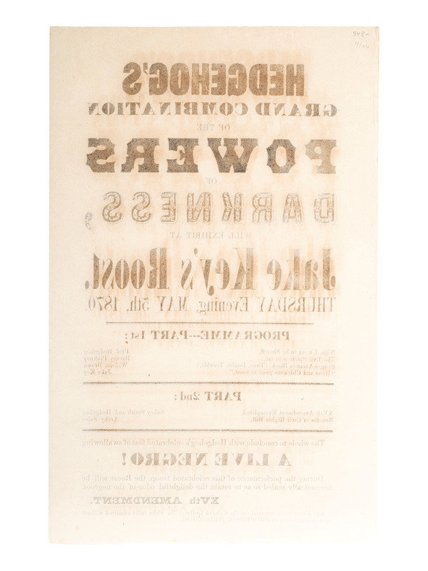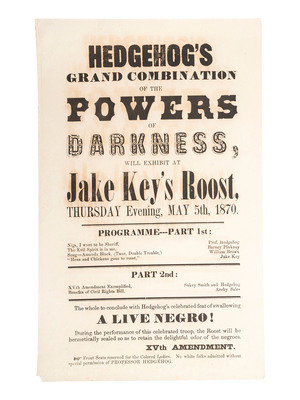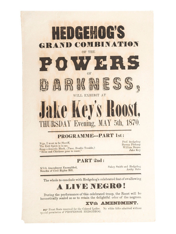 An anti-Fifteenth Amendment parody broadside in the style of early minstrelsy handbills. Printed in various fonts it lists the program with racist songs and “the whole to conclude with Hedgehog’s celebrated feat of swallowing a Live Negro!” The Fifteenth Amendment was ratified on 3 February 1870, which prohibited the denial of a citizen’s right to vote based upon “race, color, or previous condition of servitude.” The amendment was greeted with celebrations among African American and abolitionist communities with one of the largest held in Philadelphia on 5 May 1870, billed as the “Grand Celebration in Honor of the Ratification of the Fifteenth Amendment.” This anti-Black broadside was likely printed as an attack on the official celebration.