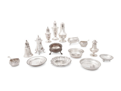 A Large Group of American Silver Salt and Pepper Shakers, Cellars and Finger Bowls