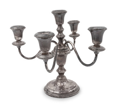 5 total, including a Frank Whiting weighted sterling five light candelabra and a pair of weighted sterling three light candelabra, and a pair of candlesticks marked wmfn