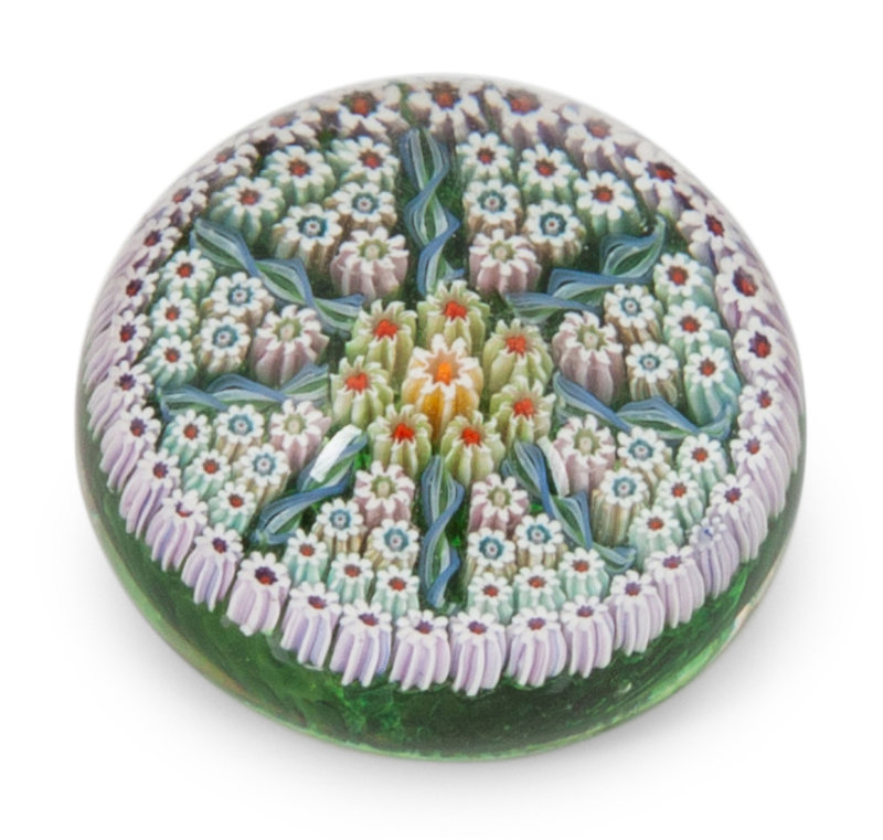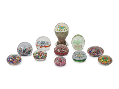 group of 11 includes 5 millefiori paperweights, 4 caned glass paperweights and two floral paperweights