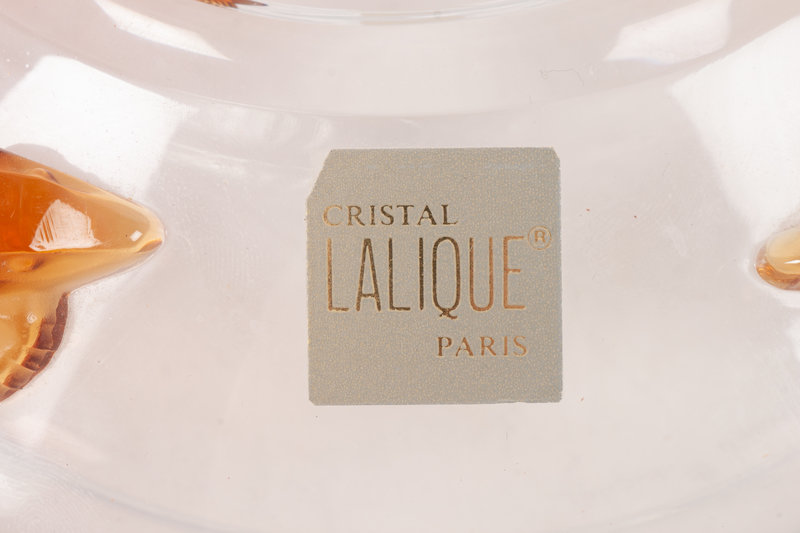 with amber serpents on a clear glass bowl, engraved Lalique France, and includes original sticker