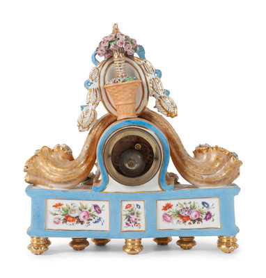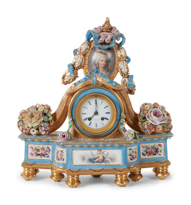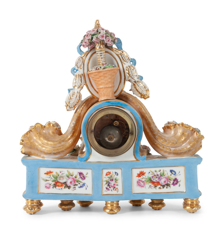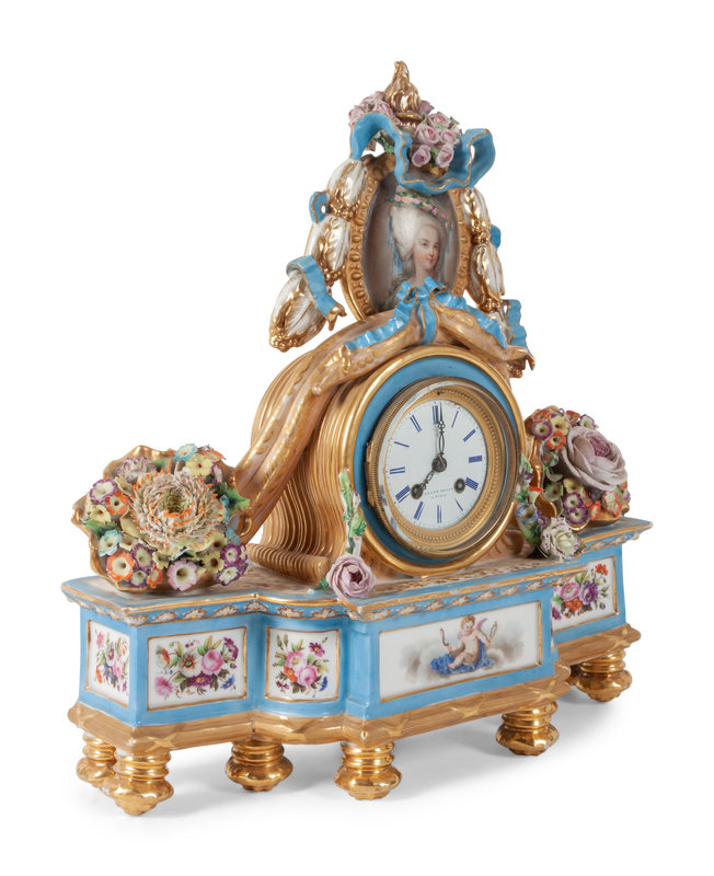 the face is marked Jacob Petit a Paris, and is flanked by floral designs and ribbons, topped with a painted portrait of a woman
