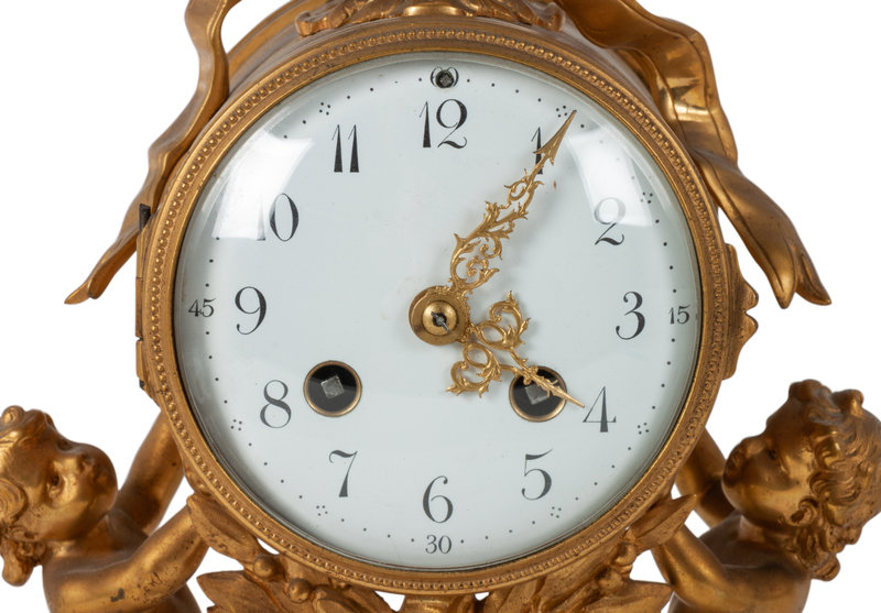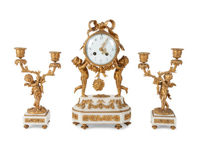 featuring a gilt bronze clock with sunburst pendulum, flanked by 2 two light cherubic candelabras, all on marble bases