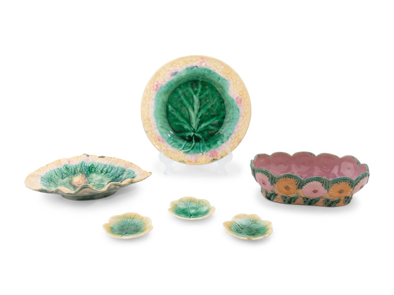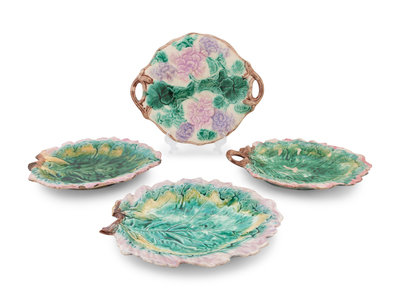 comprising of three small cabbage leaf dishes, two handled floral motif trays, four various leaf form dishes and one daisy form bowl