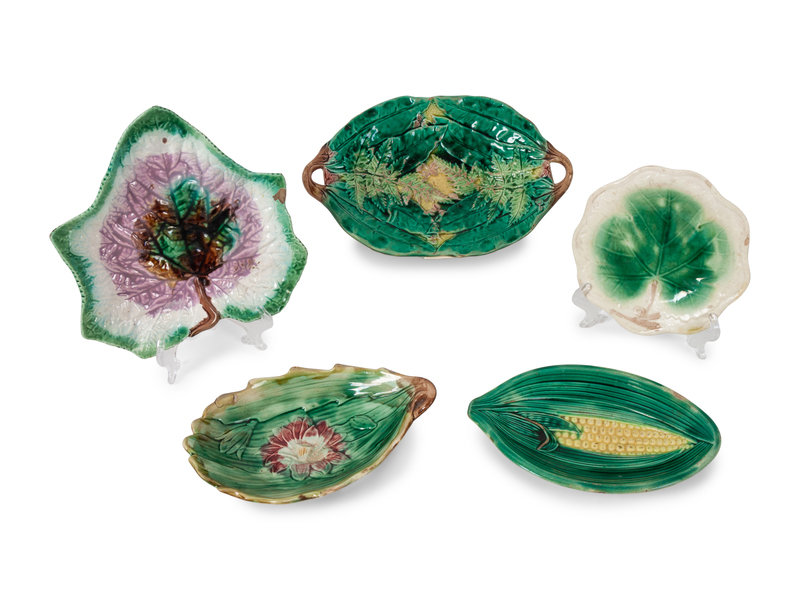 includes a lily form compote, a pipe tray, a two handled fern tray, a corn form tray and seven other leaf form dishes