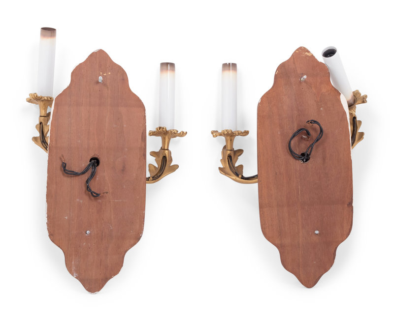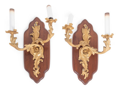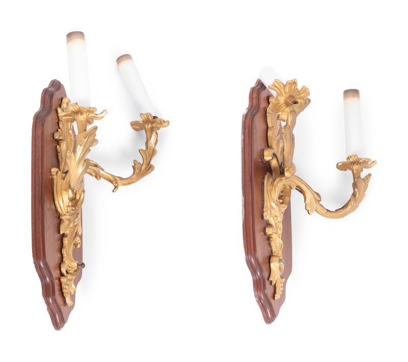 A Pair of Louis XV Style Gilt Metal Two-Light Sconces on Walnut Plaques