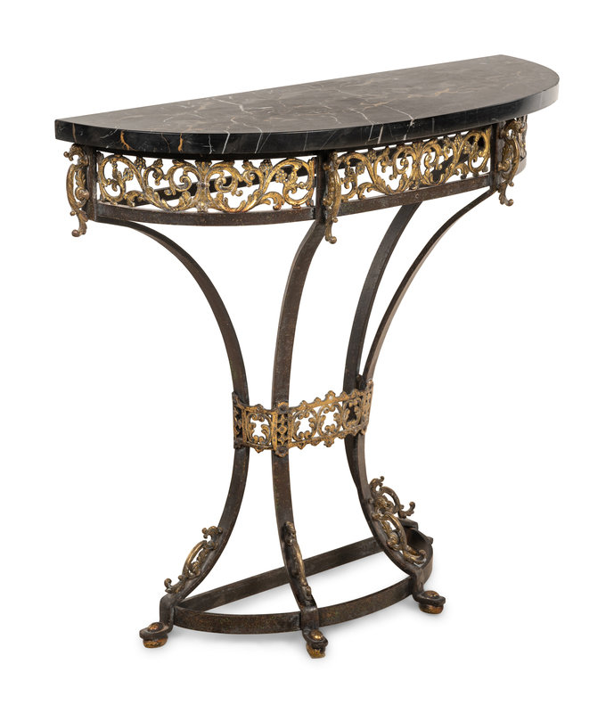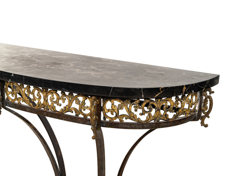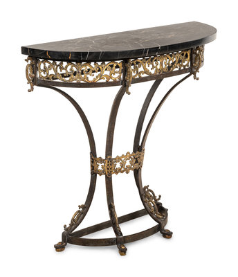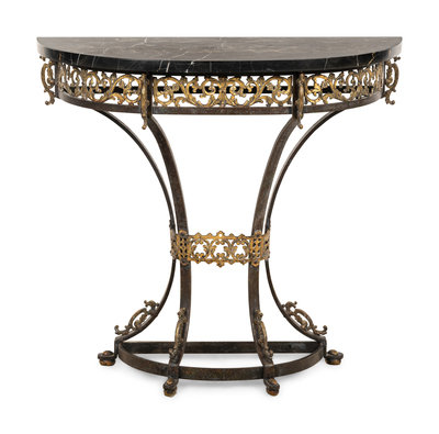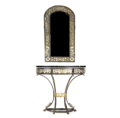 A Continental Ebonized and Parcel Gilt Metal Marble-Top Console Table and Mirror
