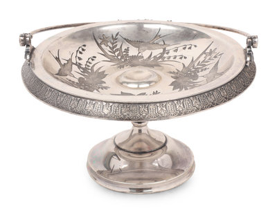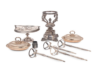 comprising a pair of Matthew Boulton covered entrée dishes; an English épergne; an American cake basket and an American wood barrel-form napkin ring; 5 items total.