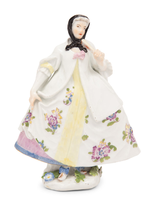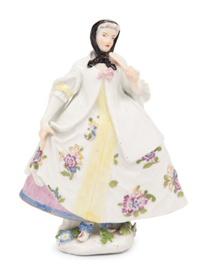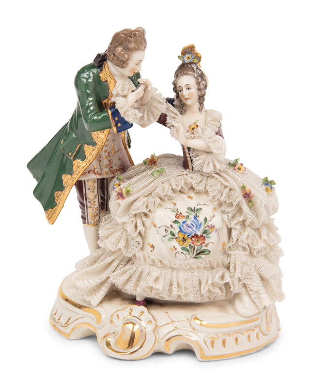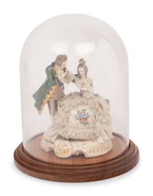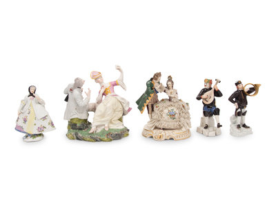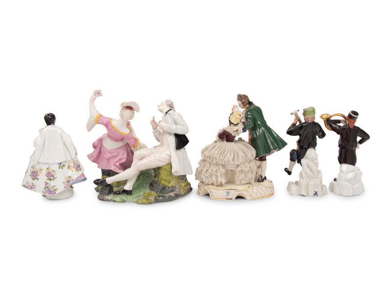 comprising a pair of musicians, each bearing spurious crossed swords in underglaze blue; one figural group with a glass dome and a wood stand, marked Germany; another figural group bearing a blue pinwheel mark.