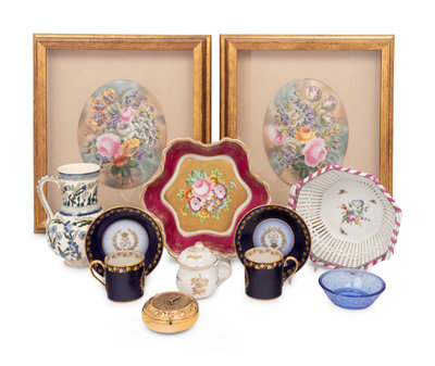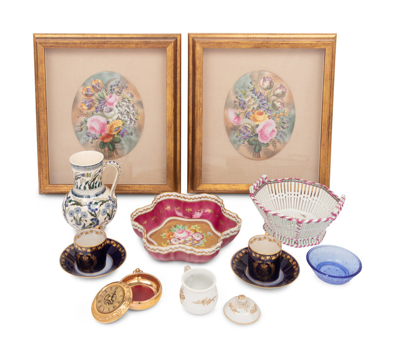 comprising a pitcher, a pair of Sèvres cups and saucers, a pair of painted plaques, a reticulated basket, a French ceramic candy dish, a custard cup and a gilt decorated pocket watch-form covered jar, most bearing various marks from respective makers; 11 items total.