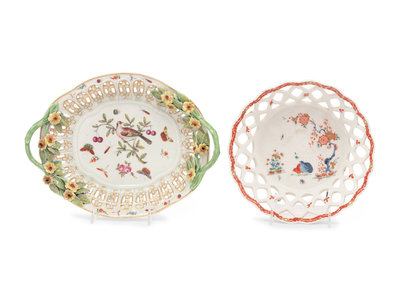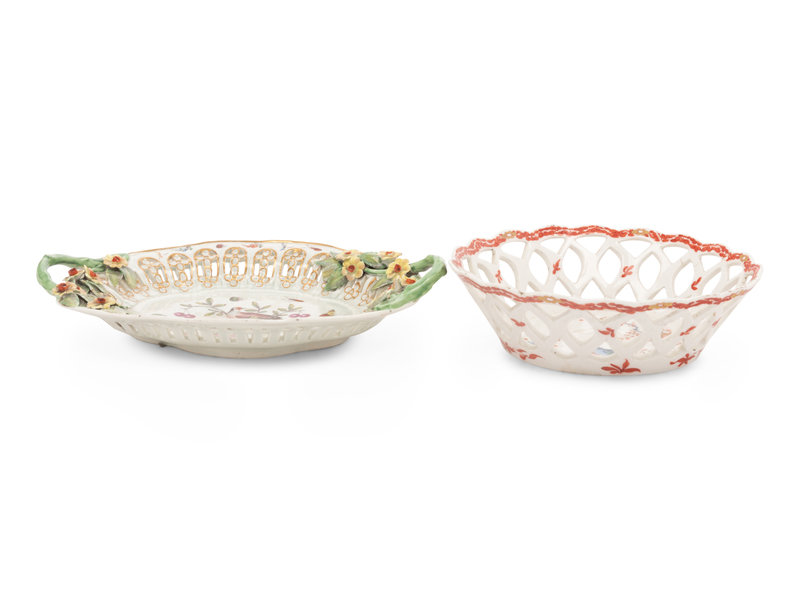 comprising a reticulated dish bearing three paper labels that read Bow, Esperance and From Mrs. Herman C. Krannert Normandy Farm New August, Indiana to the underside, together with a twin-handled example bearing red crossed swords above a D and a Marshall Field & Co. paper label to the underside.