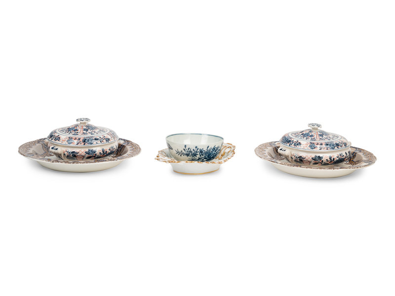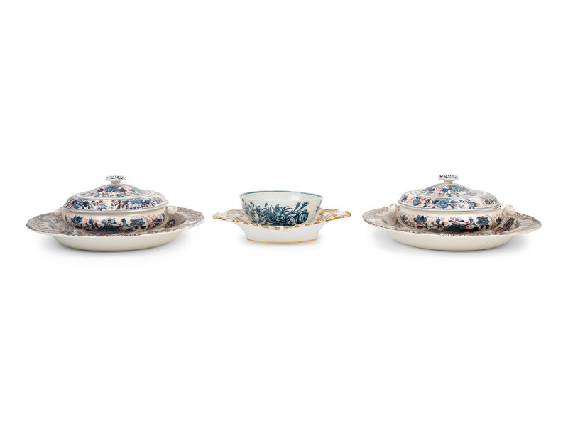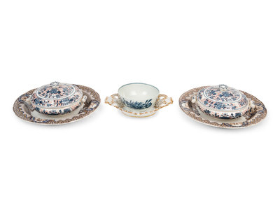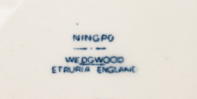 comprising a pair of Copeland and Garrett trays stamped and impressed Copeland & Garrett New Blanche to the underside, a pair of Wedgwood Ningpo pattern covered dishes stamped Wedgwood Etruria England to the underside, a gilt decorated reticulated tray with faint incised marks to the underside, and a Worcester bowl bearing a crescent mark in underglaze blue to the underside; 6 items total.