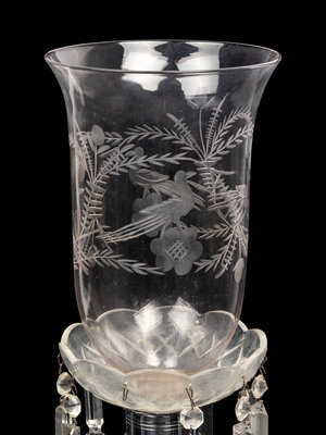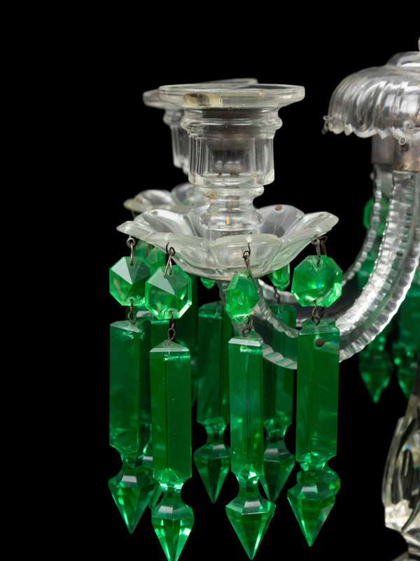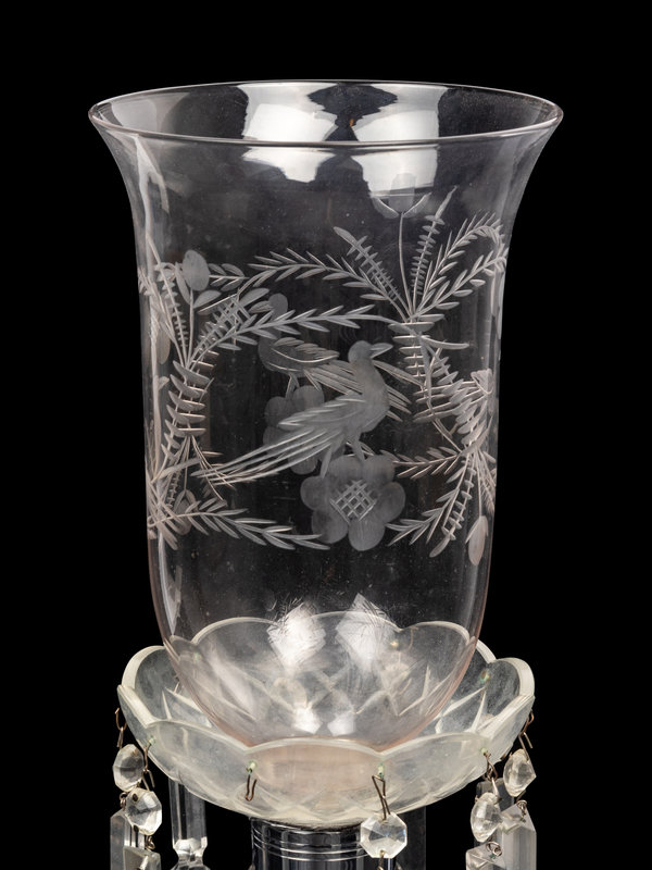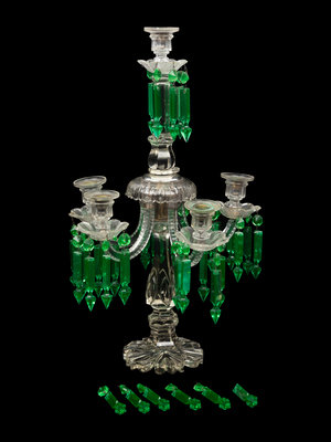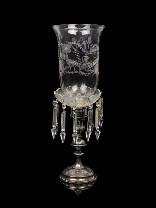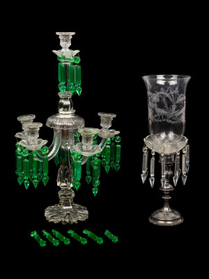 An Irish Cut and Colored Glass Six-Light Candelabrum and an American Silver-Plate Etched and Cut Glass Hurricane Lamp
