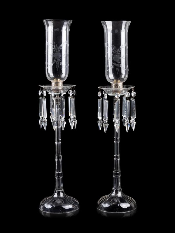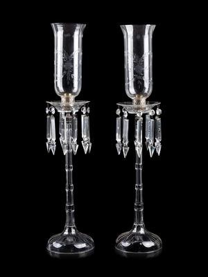 A Large Pair of English Cut and Etched Glass Candlesticks