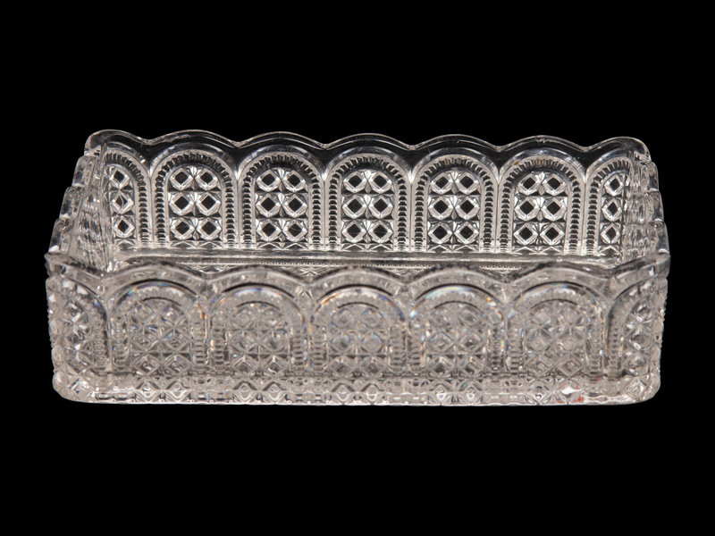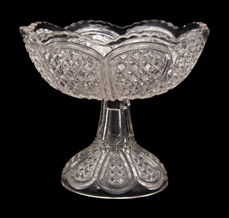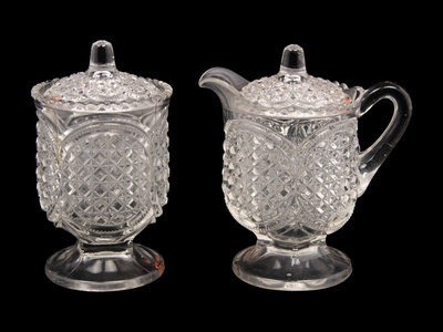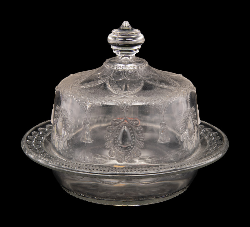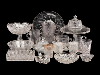 comprising a Pattern 11 tumbler; a horseshoe tumbler, spooner, cake stand, Invincible pattern spooner; a covered butter dish, sauce dish, creamer, Austrian pattern bowl, covered creamer, tumbler and dish; a compote, covered jar, Teardrop and Tassel pattern pitcher, bowl and covered butter dish, Cord Drapery pattern platter, Holly pattern bowl, Serenade pattern plate and a Fleur-de-Lis pattern twin-handled celery holder; 24 items total.