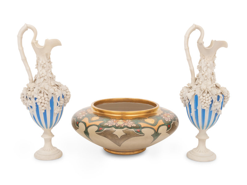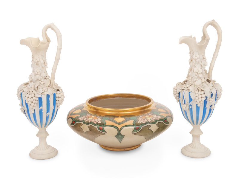 comprising a pair of United States Pottery Co. ewers, each unmarked, and a bowl inscribed Mc.Nilgenberg Dec. 25 '09 to the underside.
