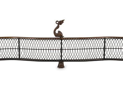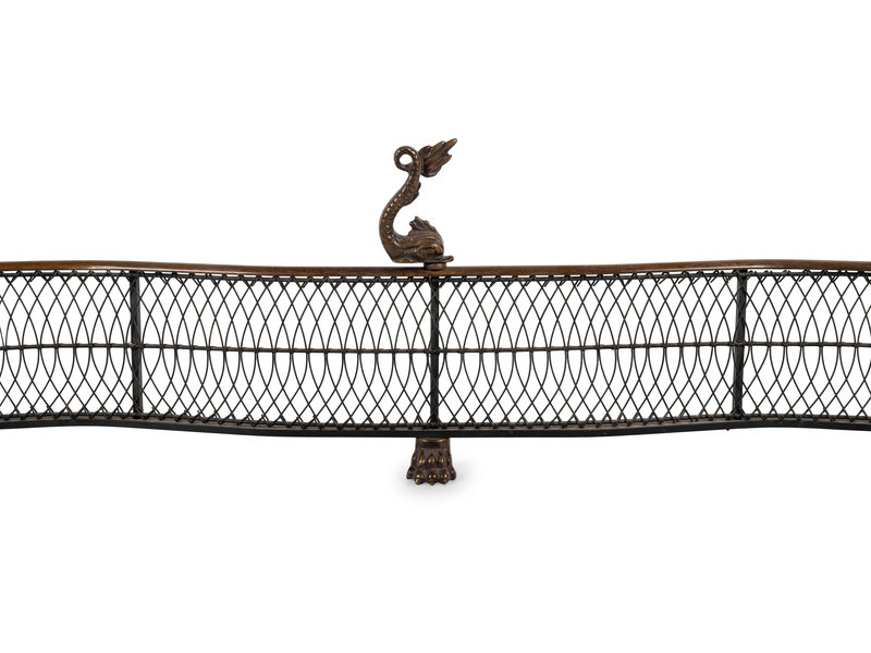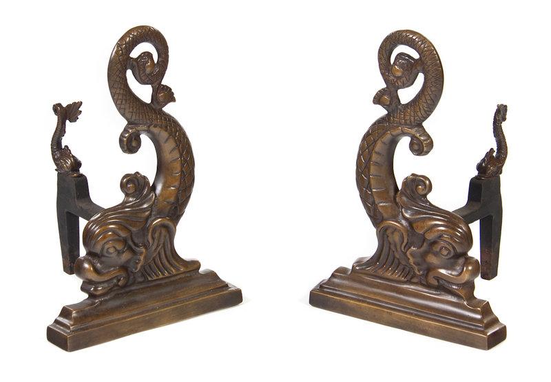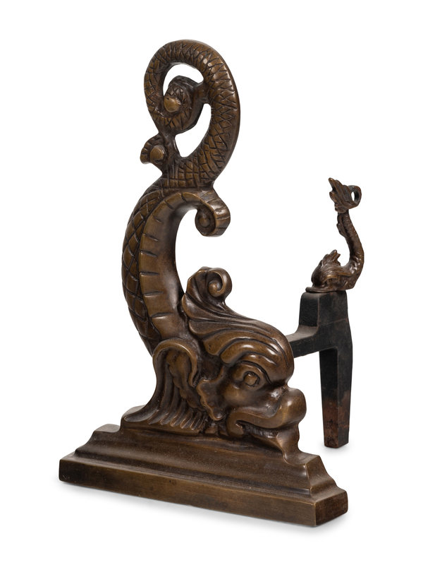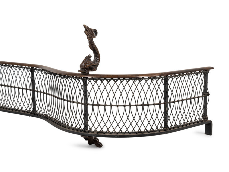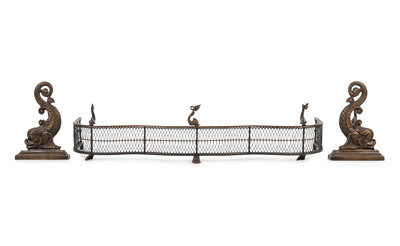 A Pair of Dolphin-Form Andirons and a Fender