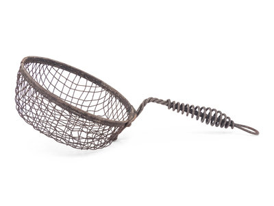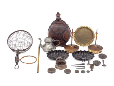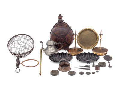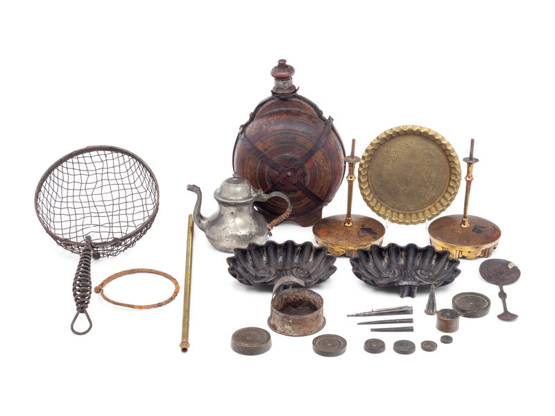 comprising a pair of scalloped shell trays, a strainer cooking utensil, a Dutch pewter teapot, a pair of drapery tie-backs, weights, a water canteen, an Indian brass dish, a candlestick, a double-sided spoon, a dram weight, a stick pin, a set of seven metal weights, lamp parts and other small metal pieces.