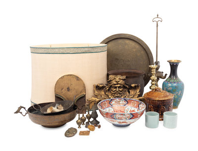 comprising a metal cauldron, a brass serving bowl and tray, an oil lamp, three rods with urn finials, an amber glass bead, a stopper, a medallion, a copper bucket, a shell, a painted metal ornament, an Imari pattern porcelain bowl, a cloisonne vase, a brass candlestick, a carved wood article, an ornament fragment, a wood fragment, a mirror fragment, a paper roll, lamp parts, two ceramic jardinieres, a ceramic underplate, a finial, a plaque of James Whitcomb Riley, a metal disk, a box of metal and glass parts, and other articles.