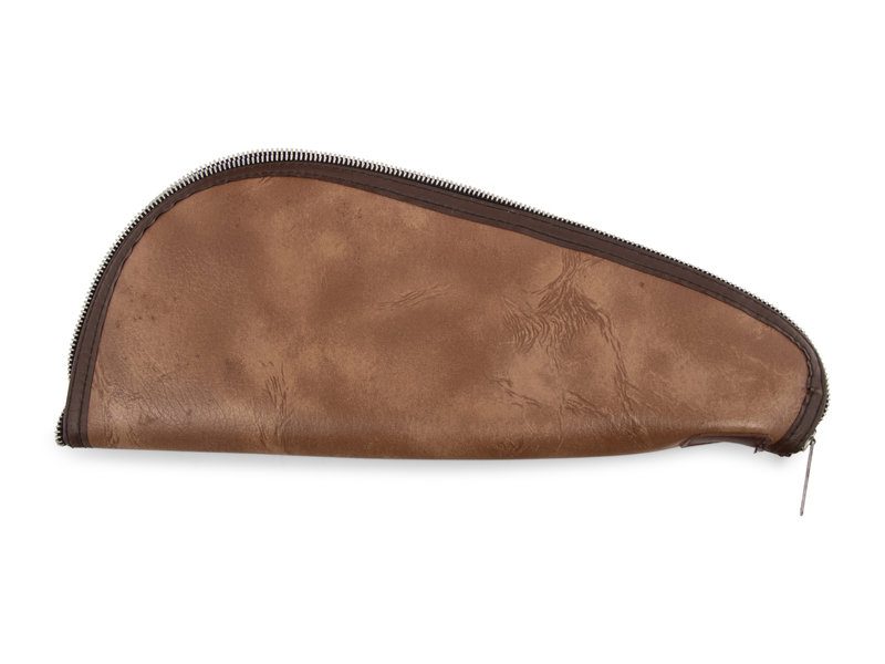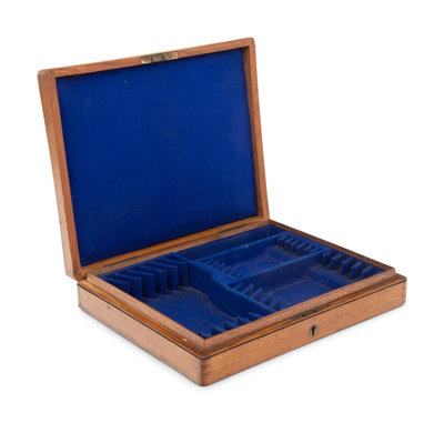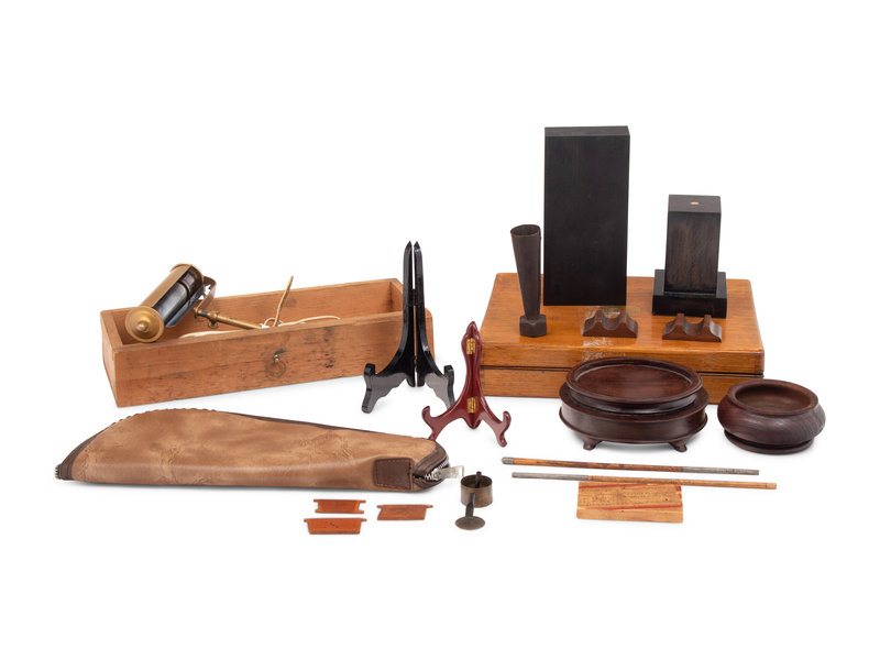 comprising two black wood block stands, a wood bowl-form stand, a wood drawer, a flatware case, a metal stand for a Portland vase, two folding stands, an oval wood stand, a leather firearm carrying case, a picture frame lamp, two wood rods with metal tips, a hex-nut mounted metal article and other small wood and metal parts.