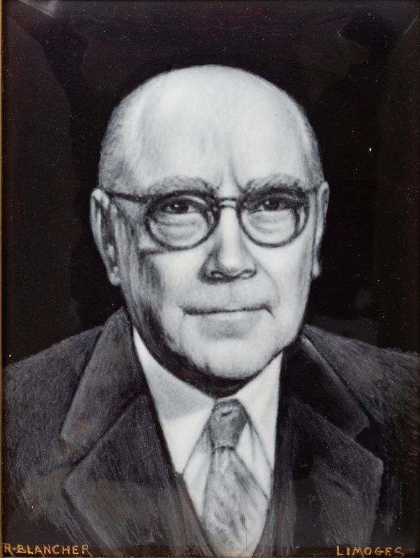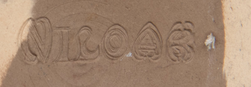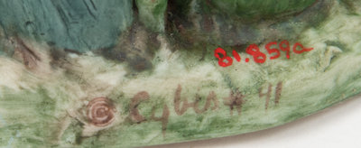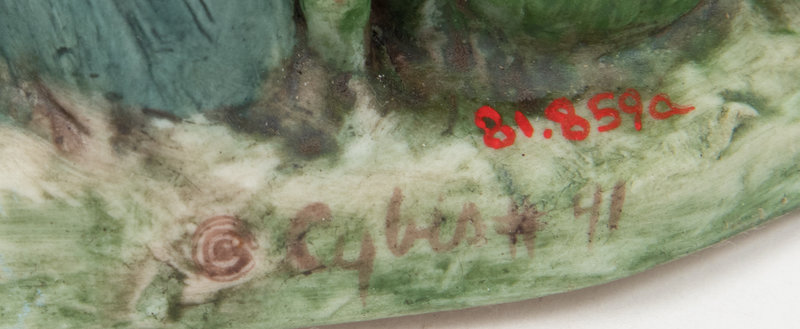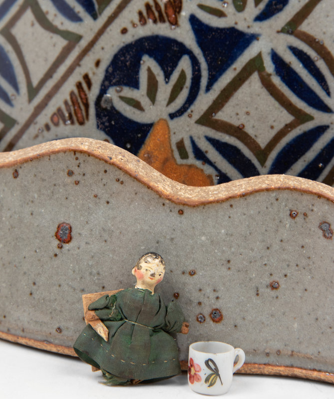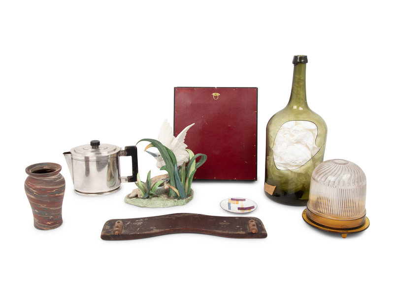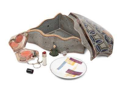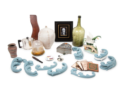 comprising a miniature doll and toy teacup, a compact cosmetic case with attached lipstick holder, an enamel on copper portrait signed R. Blancher for Limoges, a glass bottle, an enamel ash tray, an Arts & Crafts trivet, three amber-toned mirror glass panels, a piece from a German Richard Berek's tobacco pipe, a footrest for a highchair, a teapot, a Niloak Pottery Co. vase, a Cybis porcelain figural group, a fly catcher, a ceramic box, a ceramic vase, and a collection of eighteen blue and white plaster moldings; 36 items total.
