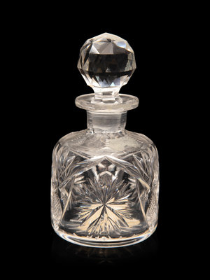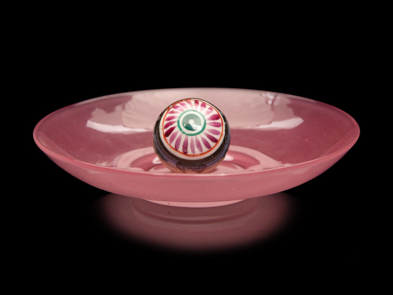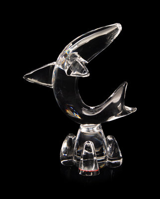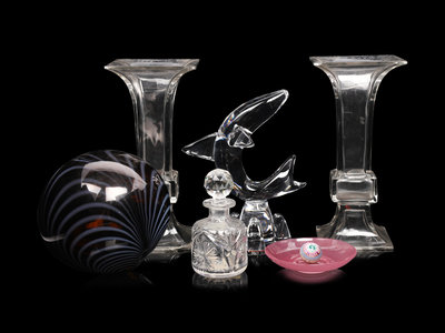 comprising a pair of vases, a painted marble, a ball-form vase, a Steuben Sea Sprite sculpture with cake plate centerpiece designed by George Thompson, each bearing an etched signature to the underside, a Steuben saucer signed J. Eardin and inscribed Steuben to the underside, and a cut glass liquor bottle with stopper; 7 items total.