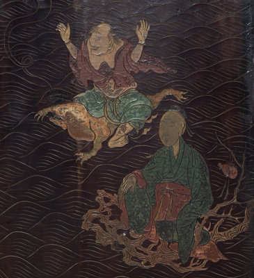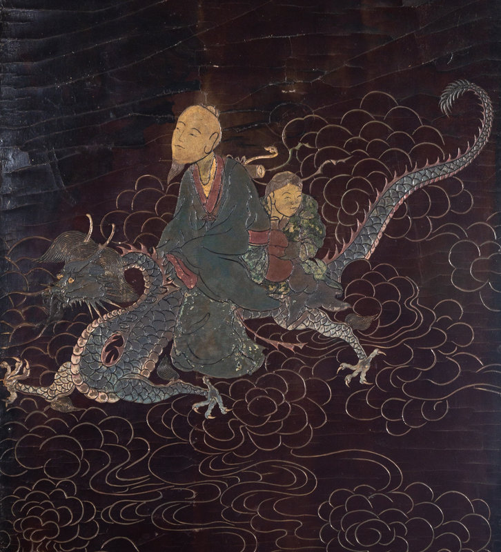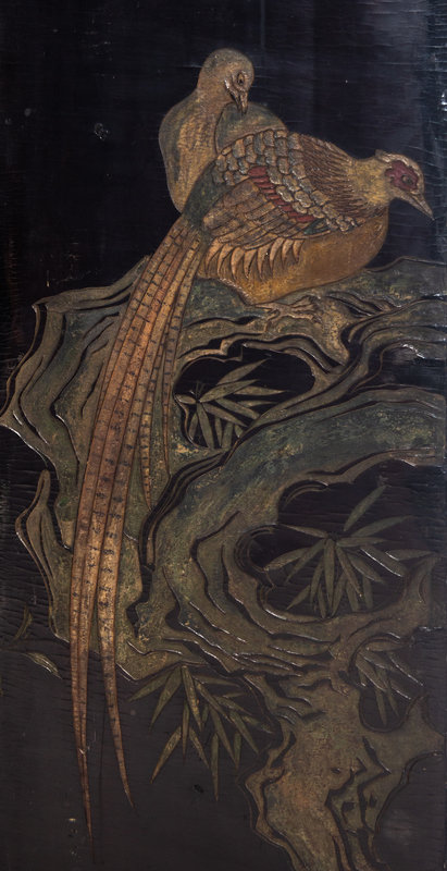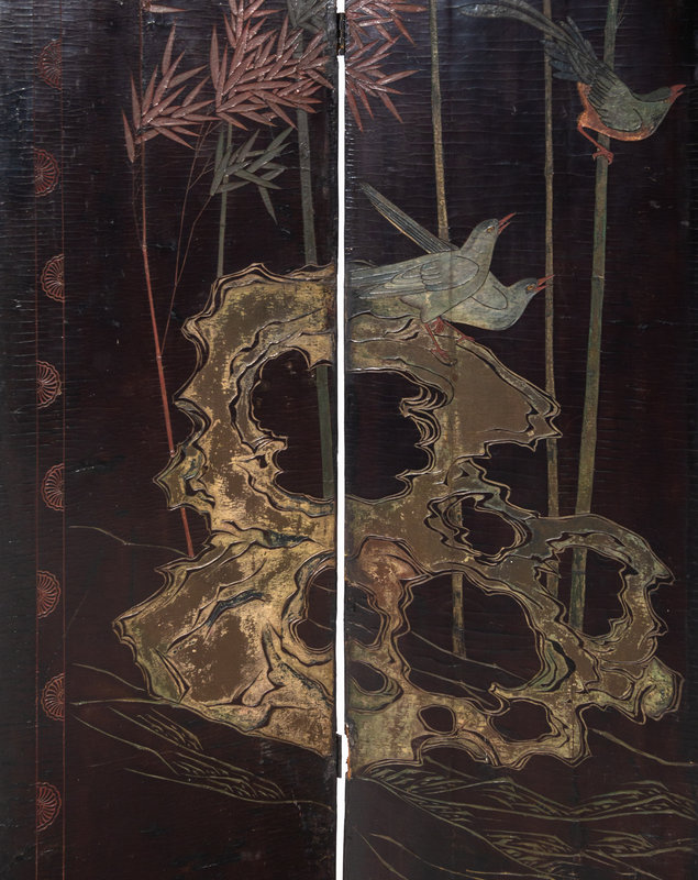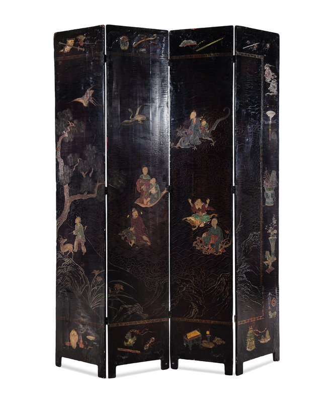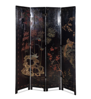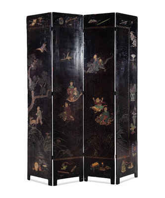 A Chinese Export Black Lacquered Four-Panel Floor Screen