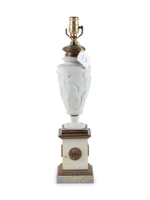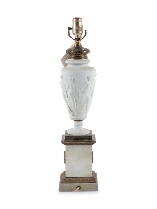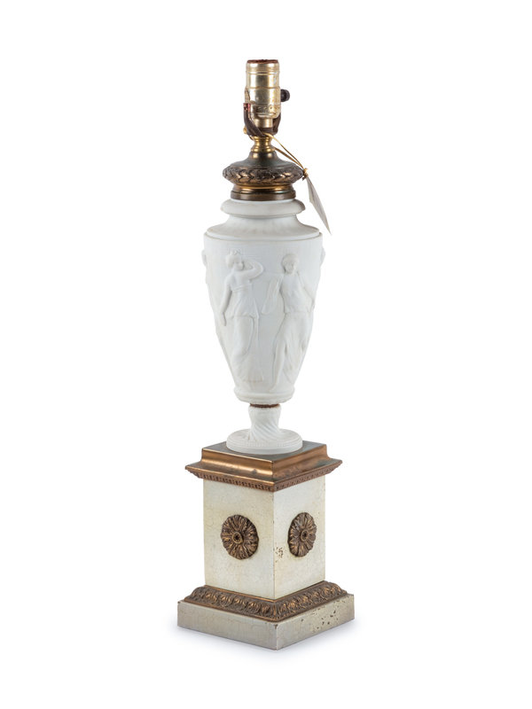 A Neoclassical Bisque Porcelain and Gilt Metal Mounted Table Lamp