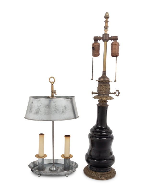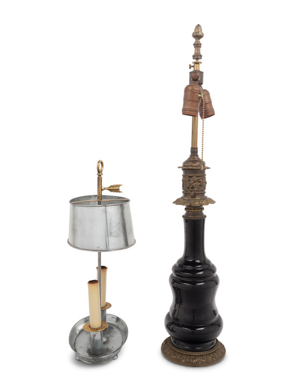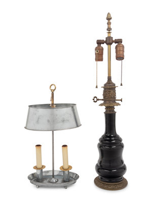 of bottle form with faux oil lamp fittings, together with a silvered metal bouillotte lamp.