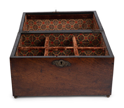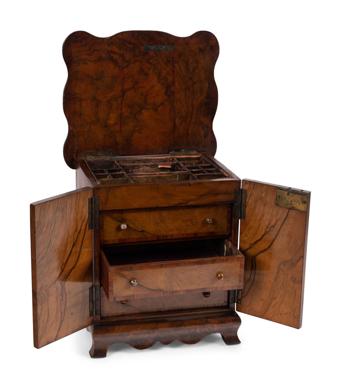 An English Burlwood Jewelry Box, a Diminutive Chest and Other Articles