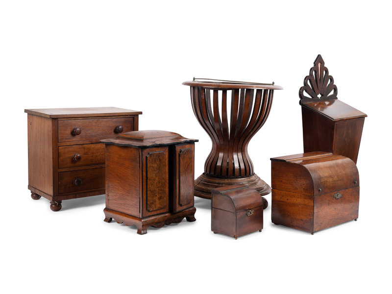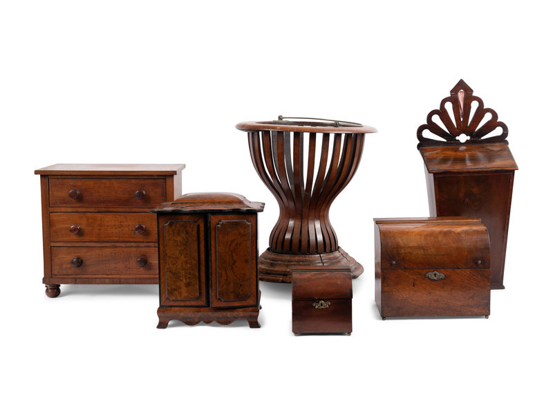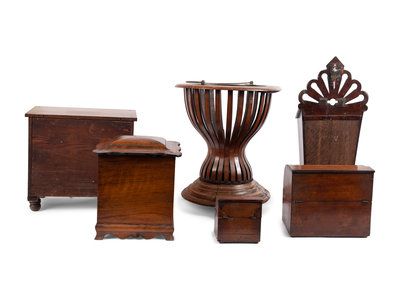 the other articles including a tea caddy, a decanter caddy, a wall-mount candle box, a jardiniere and a small jewelry box.