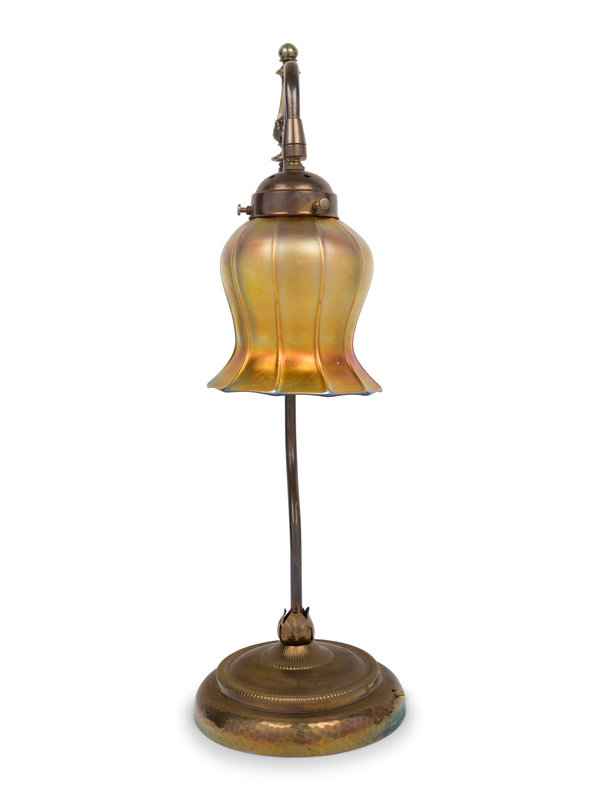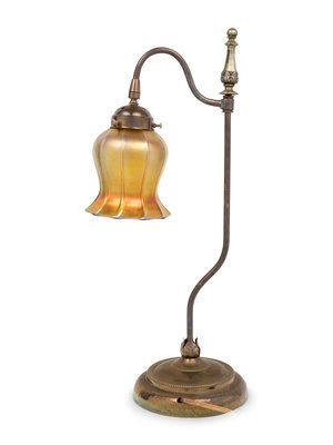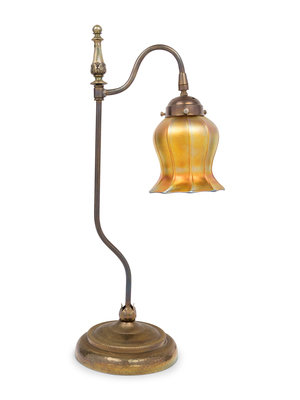 A Brass Table Lamp With Quezal Iridescent Glass Shade