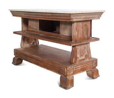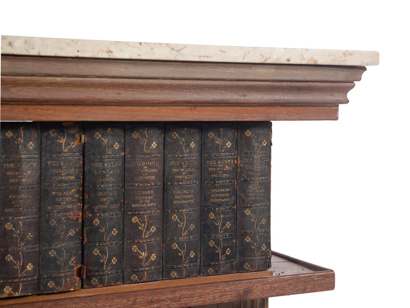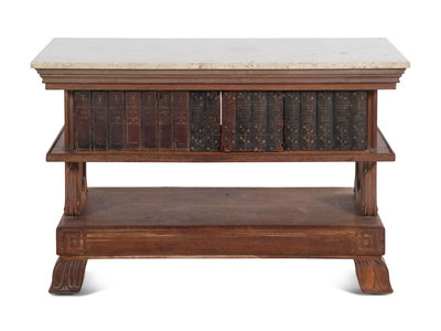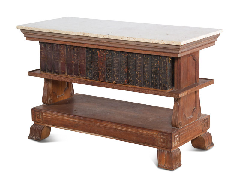 A Carved Marble-Top Console Table with Faux Books