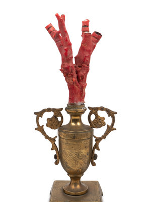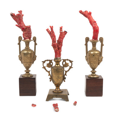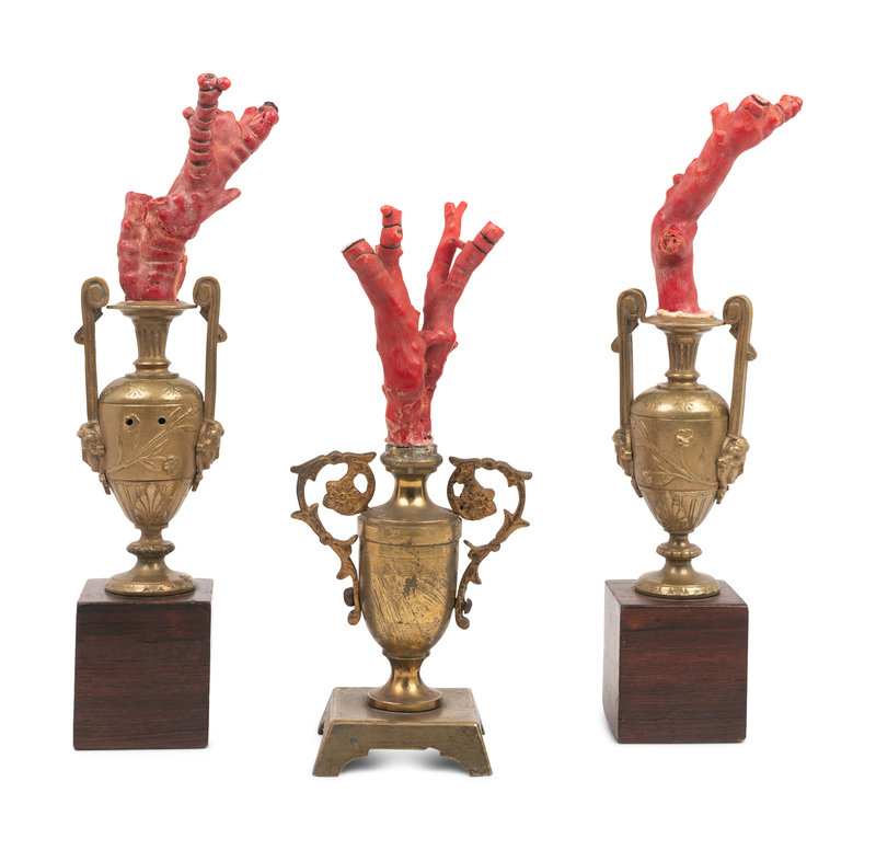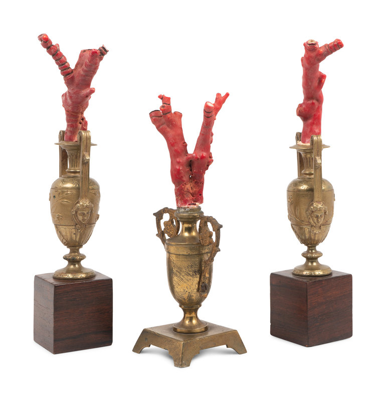 A Coral Specimen Mounted Three-Piece Gilt Metal Garniture