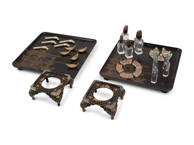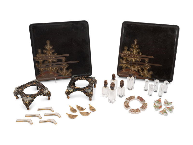 including spoon rests and place markers, together with two lacquered vase stands; 30 items total.