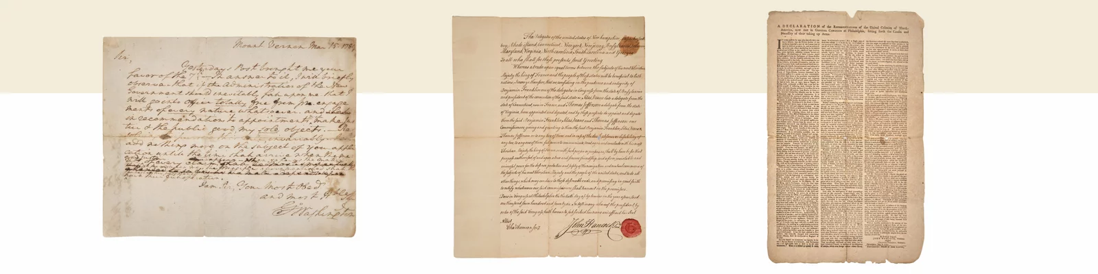 (Left to Right: Lot 148 | [Washington, George] Washington, George. Autograph Letter, signed; Lot 29 | [American Revolution] Hancock, John. Manuscript Document, signed; Lot 23 | [American Revolution] (Dickinson, John, and Thomas Jefferson). A Declaration...setting forth the Causes and Necessity of their taking up Arms )