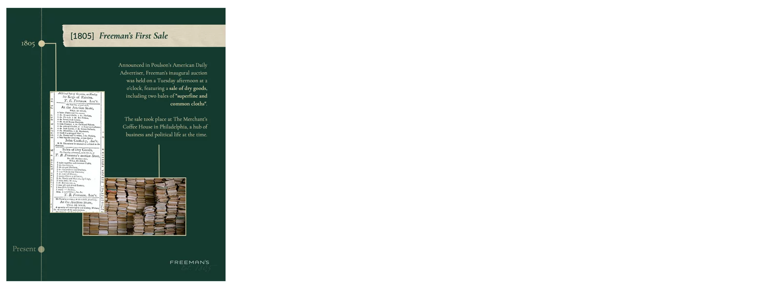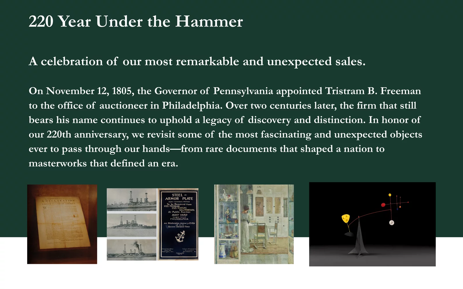 Few moments in our nation’s history hold as much power as the signing of the Declaration of Independence. Freeman’s was honored to bring one of the rare surviving copies to auction—a tangible connection to the birth of American liberty. Its sale reaffirmed our longstanding expertise in historic manuscripts and the enduring resonance of America’s founding ideals.